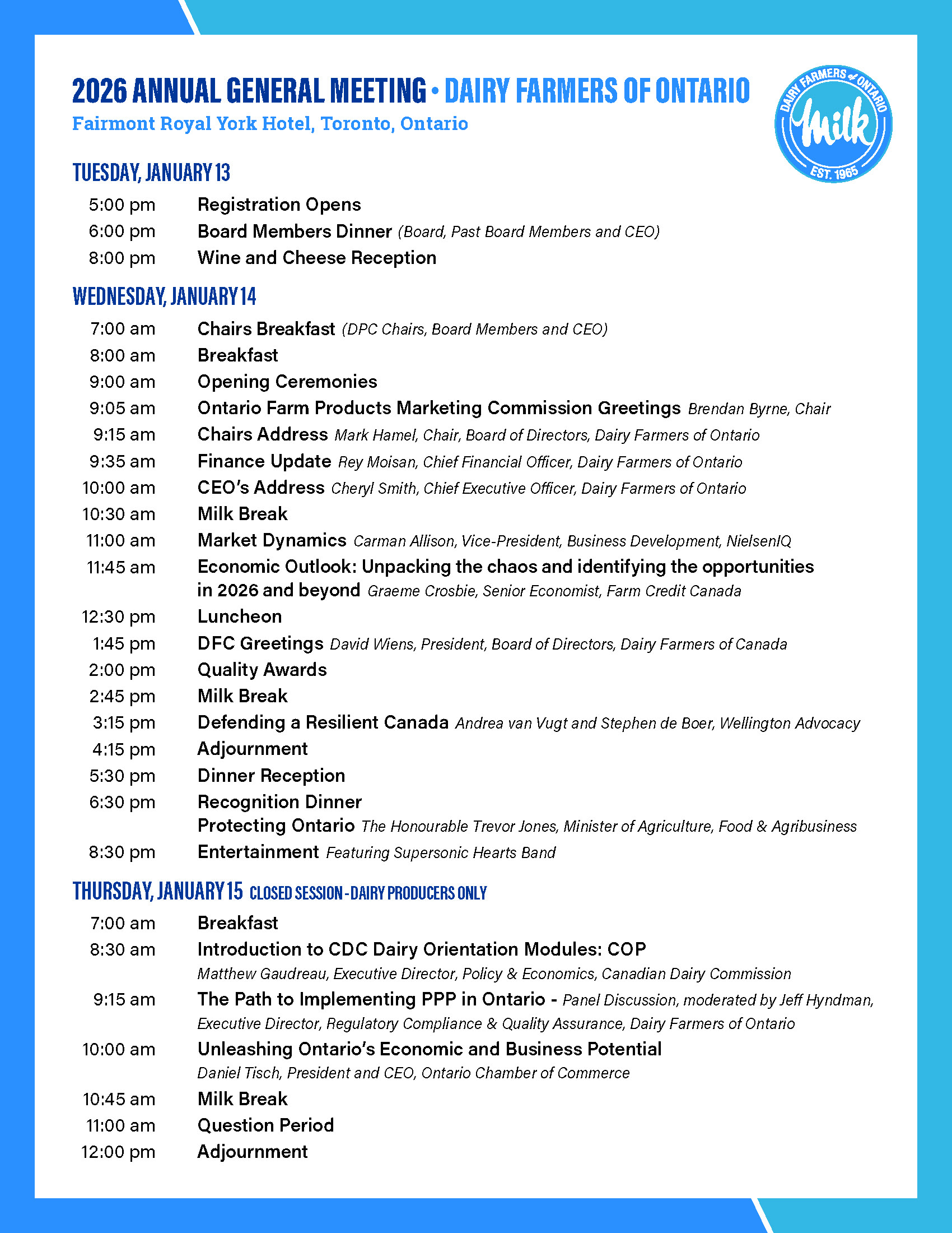 Celebrate a milestone with us on January 13-15, 2026 at Toronto’s beautiful Fairmont Royal York Hotel! Join us for our Annual General Meeting (AGM), an event filled with inspiration, connection and celebration of our shared achievements within the dairy industry.
